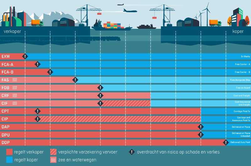 Ben je exporteur of importeur? Dan maak je met je buitenlandse zakenpartner afspraken over het vervoer van de goederen. Door het afspreken van Incoterms® weet je wie van beiden verantwoordelijk is voor het regelen van het vervoer en wie de kosten van het vervoer betaalt. En bij wie het transportrisico ligt. Dit is het risico van schade aan, of verlies van de goederen tijdens het vervoer. Er zijn meerdere Incoterms®-regels met verschillende verplichtingen en verantwoordelijkheden voor verkoper (exporteur) en koper (importeur).